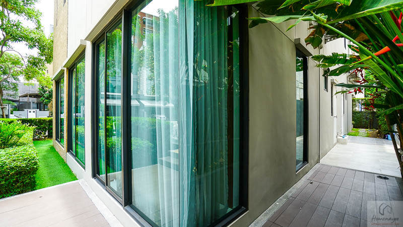 ฝั่งด้านหน้าเป็นระเบียงมีประตูกระจกเปิดเชื่อมออกไปได้ และมีช่องแสงขนาดใหญ่แบบเต็มผนังที่เพิ่มความโปร่งให้กับบ้าน