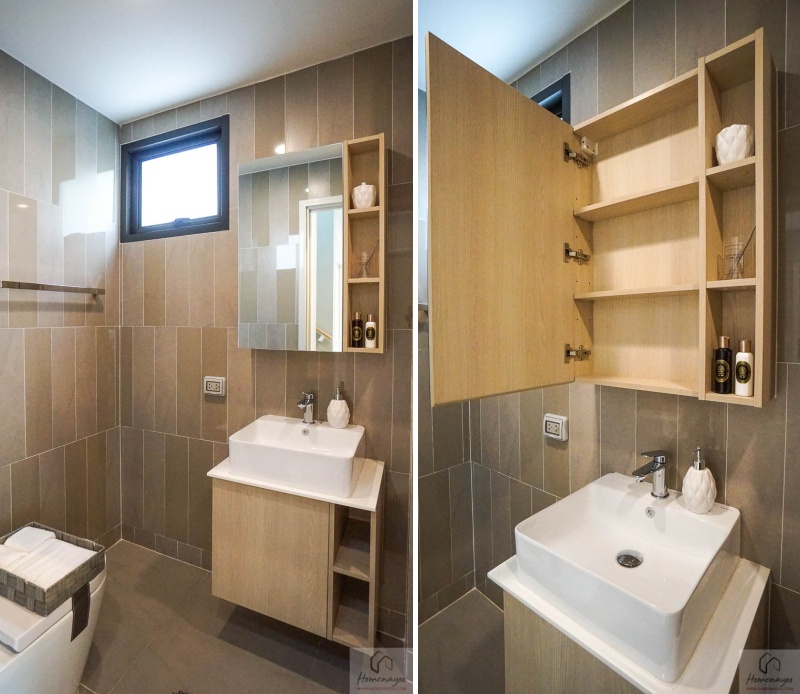 ด้านในสุดจะเชื่อมต่อกับห้องน้ำ ภายในห้องน้ำขนาดใหญ่แบ่งส่วนเปียกส่วนแห้ง พร้อมฟังก์ชันการใช้งานครบ