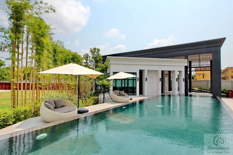 ด้านข้างสระวางโซฟาทรงกลมสำหรับพักผ่อนริมสระ โดยไม่ต้องกลัวว่าจะร้อน เพราะโครงการมีร่มขนาดใหญ่คอยให้ร่มเงา