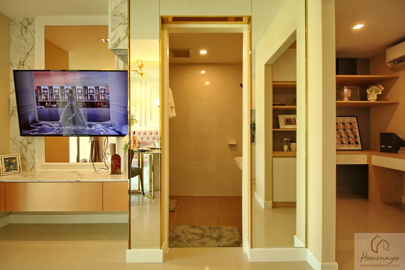 มองย้อนกลับไปที่บริเวณ Walk-in Closet จะเห็นว่าทางโครงการบิวท์อินตู้เสื้อผ้าขนาดใหญ่เอาไว้ทั้ง 2 ด้าน หากรู้สึกว่าตู้เสื้อผ้าใหญ่เกินความจำเป็น อาจจะปรับด้านนึงทำเป็นโต๊ะเครื่องแป้งก็ได้