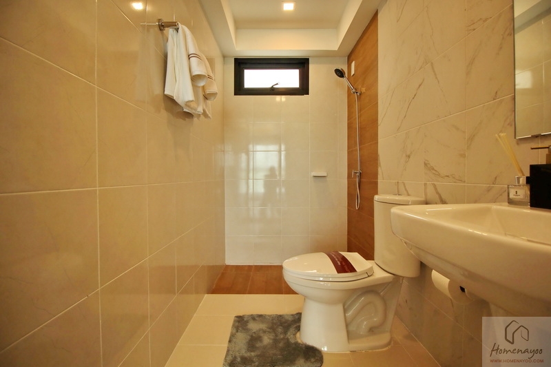 ส่วนเปียกอาบน้ำมีการลดระดับลงเล็กน้อยกันน้ำไหลไปส่วนแห้ง ทางโครงการเลือกใช้กระเบื้องลายไม้ มีฝักบัวและที่แขวนทิชชู่ และที่สำคัญมีช่องหน้าต่างบานกระทุ้งสำหรับรับแสงและเปิดให้อากาศถ่ายเทได้