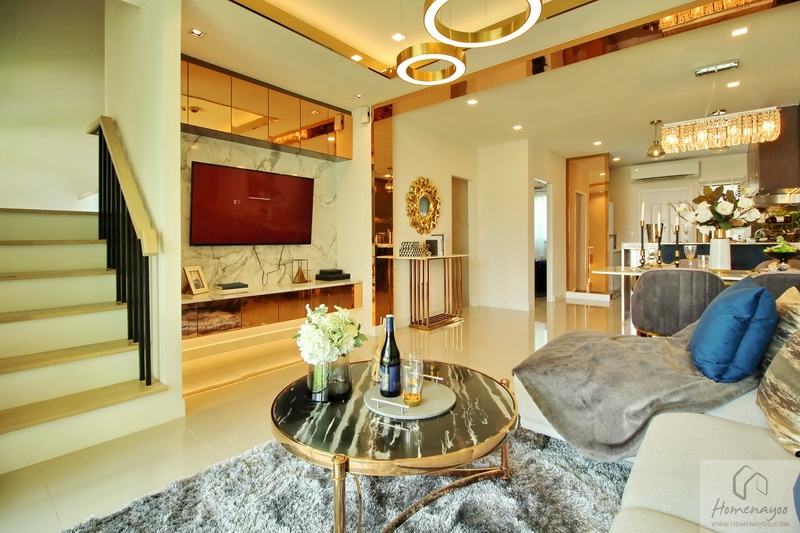 ห้องนั่งเล่นสามารถจัดวางชุดเฟอร์นิเจอร์ขนาดใหญ่ วางโซฟาเพื่อรองรับประมาณ 5 คนหรือจะเป็นโซฟาตัว L จากนั้นวางโต๊ะกลาง บิวท์อินชั้นวางทีวีที่บริเวณผนังฝั่งบันได ยังคงเหลือพื้นที่กลางบ้านให้สามารถเดินผ่านเข้าออกได้อย่างสะดวกสบาย เป็นผลมาจากหน้ากว้างของบ้านที่มากถึง 5.6 เมตรนั่นเอง