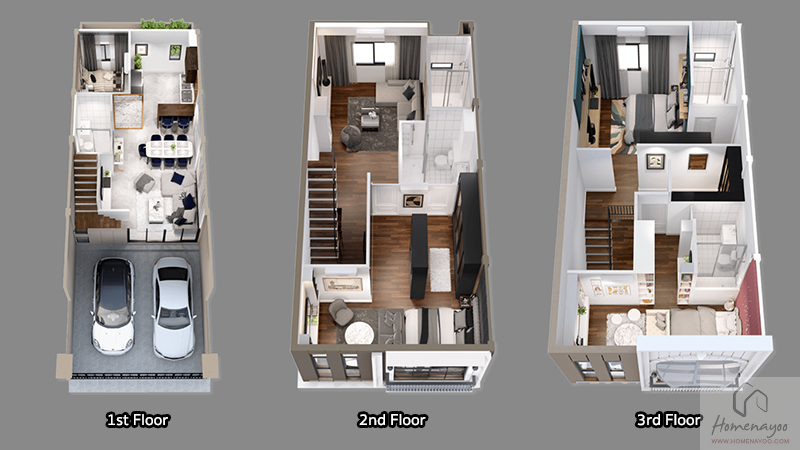 ขนาดที่ดินเริ่ม 18.1 ตร.ว. / พื้นที่ใช้สอย 166 ตร.ม. / 3 ห้องนอน 4 ห้องน้ำ 1 ห้องอเนกประสงค์ ที่จอดรถ 2 คัน