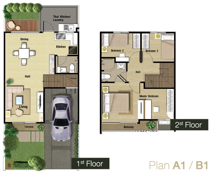 โดยเมื่อเข้ามาในบริเวณบ้านจะเจอกับพื้นที่จอดรถขนาด 2 คัน ข้างพื้นที่จอดรถ จะมีพื้นที่สวนหน้าบ้านเหลือนิดหน่อย สามารถจะจัดเป็นสวนหย่อมเล็กๆ ปลูกต้นไม้ หรือจะวางโต๊ะเก้าอี้เล็กๆ ไว้นั่งพักผ่อนก็ได้ค่ะ ห้องเก็บของจะอยู่ภายในตัวบ้านใต้บันได ไว้เก็บอุปกรณ์ต่างๆ เวลาเก็บอาจจะต้องเดินเข้าบ้านผ่านโถงบันไดก่อนถึงห้องเก็บของ