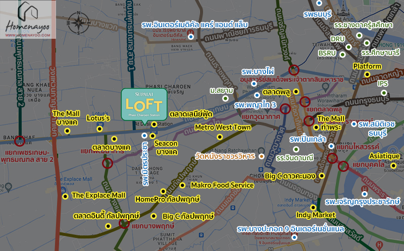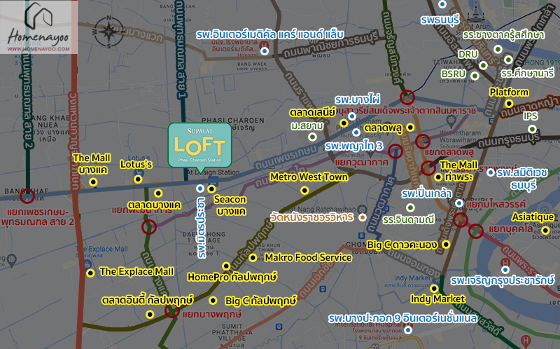 ทำเลที่ตั้งโครงการ : โครงการ Supalai Loft สถานีภาษีเจริญ ตั้งอยู่บนทำเลโซนเพชรเกษมฝั่งขาเข้า เป็นถนนเพชรเกามช่วงต้นฝั่งที่ไม่ไกลจากตัวเมืองมากค่ะ จุดเด่นของทำเลโครงการนี้คือเป็นทำเลที่มีสิ่งอำนวยความสะดวกครบ ทั้งรถไฟฟ้า MRT ภาษีเจริญ ที่อยู่ระยะเดินถึงแค่ 210 ม. และมีห้าง Seacon บางแค, ตลาดเสนีย์ฟู้ด, ร้านสะดวกซื้อใกล้โครงการ และยังมี รพ.มิตรประชา ทั้งหมดอยู่ในระยะที่เดินถึงได้ไม่ไกล ทำให้ภาพรวมเป็นคอนโดที่อยู่บนทำเลที่ใช้ชีวิตได้สะดวก คนที่ทำงานหรือเรียนในเมือง ตามแนวรถไฟฟ้า และมีงบประมาณไม่สูงมาก อยากมีคอนโดเป็นของตัวเองสักห้อง โครงการนี้ก็ถือเป็นอีกหนึ่งตัวเลือกที่น่าสนใจมากทีเดียวค่ะ