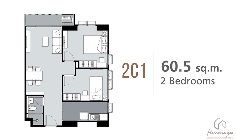 ห้อง 2 Bedroom ขนาด 53-62 ตร.ม. มี Layout ให้เลือกทั้งหมด 6 แบบ