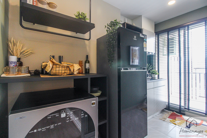 ภายในครัวมีพื้นที่กำลังดีค่ะ มีทั้งส่วนเคาน์เตอร์ที่ทางโครงการ Built-in มาให้เรียบร้อย และมีพื้นที่สำหรับวางเครื่องซักผ้า หรือทำชั้นวางของเพิ่มในครัวก็ได้