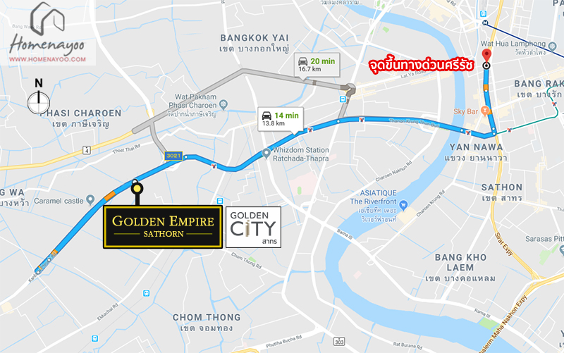 การเดินทางเริ่มจากสะพานตากสินฯ ⇒ ถ.ราชพฤกษ์ ⇒ แยกต่างระดับสวนเลียบ ⇒ ถ.กัลปพฤกษ์ ขับตรงประมาณ 500 เมตร.ถึงโครงการ Golden Empire สาทร ⇒ Golden City สาทร