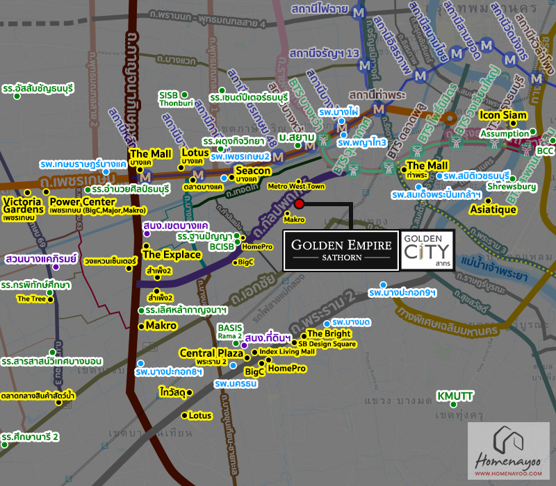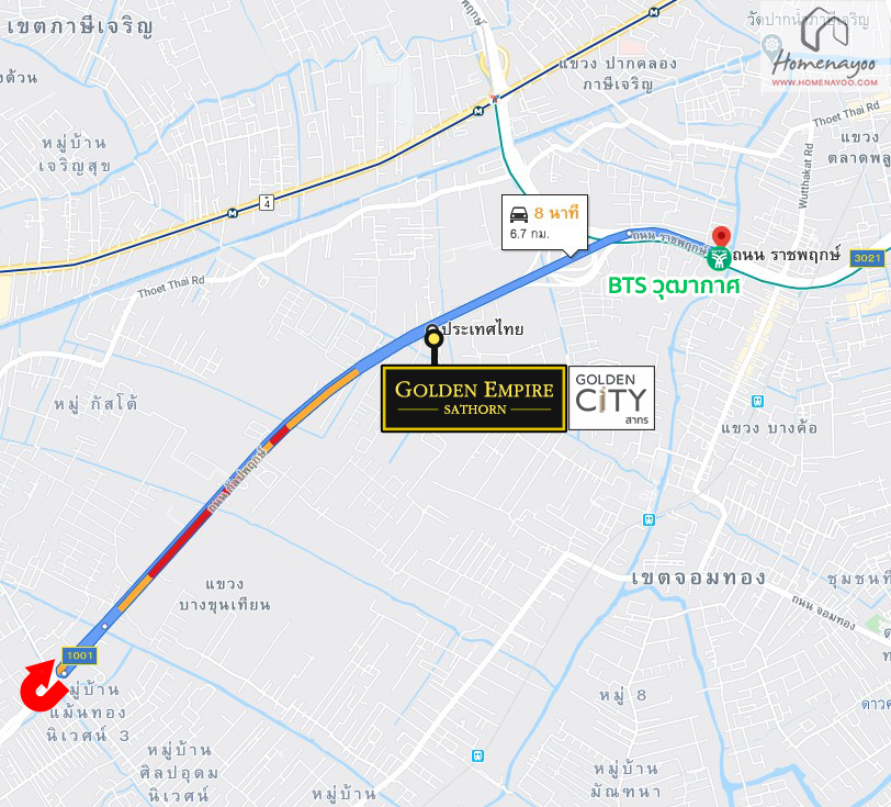 ทำเลที่ตั้งโครงการ : Golden City สาทร เป็นโครงการทาวน์โฮม 3 ชั้น ตั้งอยู่ภายในที่ดินแปลงใหญ่ของ Golden Empire สาทร ซึ่งจะอยู่ติดถนนกัลปพฤกษ์ จากโครงการสามารถเข้า-ออกตัวเมืองได้สะดวก ไม่ว่าจะออกนอกเมือง ไปยังถนนกัลปพฤกษ์, ถนนเทอดไท, ถนนเพชรเกษม, ถนนราชพฤกษ์ ได้สะดวก หรือจะเข้าตัวเมืองไปยังถนนสาทร, สีลม ก็ สะดวกเช่นกัน ตัวโครงการยังไม่ไกลจากรถไฟฟ้า BTS วุฒากาศ เพียง 1.1 กม. (วัดเส้นทางโดยใช้เส้นทางจากถนนภาระจำยอม เชื่อมไปทางซอยเอกชัย 8 ด้านหลังโครงการ)