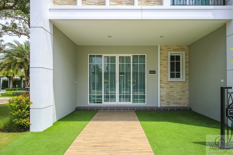 บ้านตัวอย่างตกแต่งหญ้าเทียมให้ดูเป็นไอเดีย หน้าบ้านกว้าง 5.4 เมตร บ้านมาตรฐานเทพื้นคอนกรีตเสริมเหล็กขัดหยาบ รองรับการจอดรถยนต์ได้ 2 คัน ผนังด้านข้างมีก๊อกสนามให้ 1 จุด และ เต้าเสียบปลั๊กไฟ 2 จุด เพดานติดไฟดาวน์ไลท์ให้ 2 ดวง