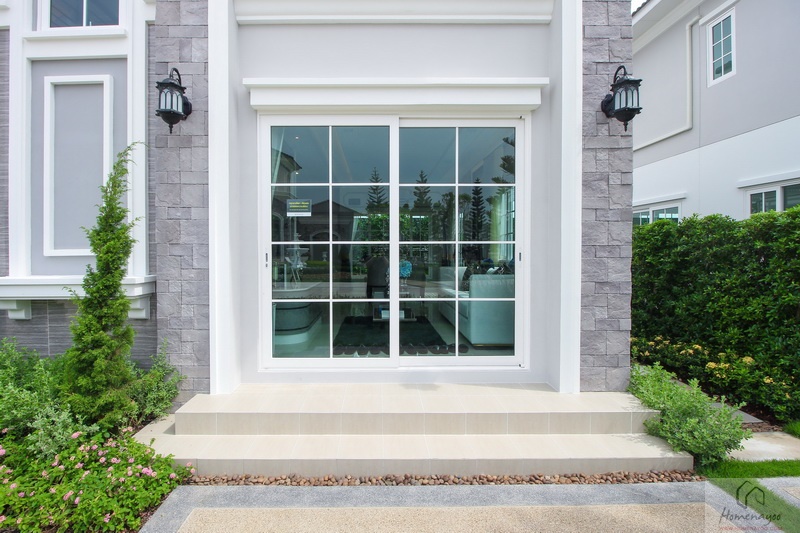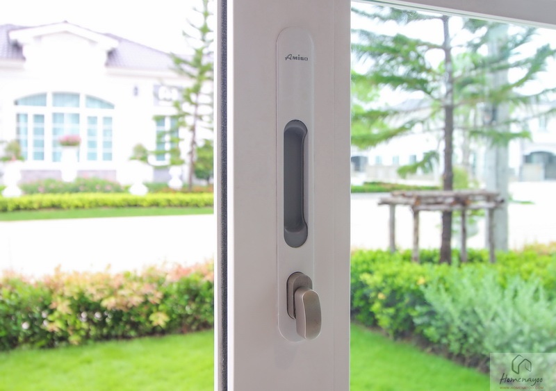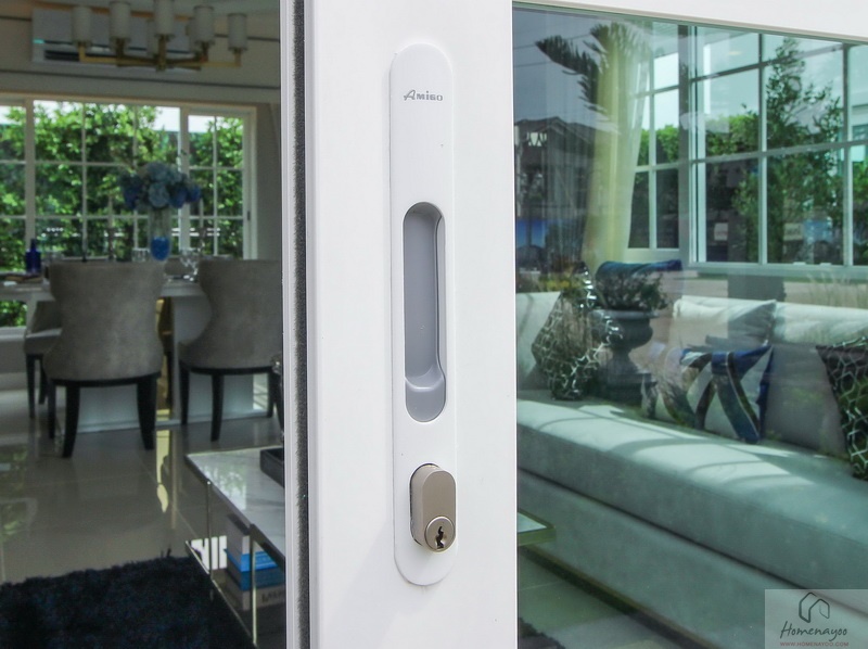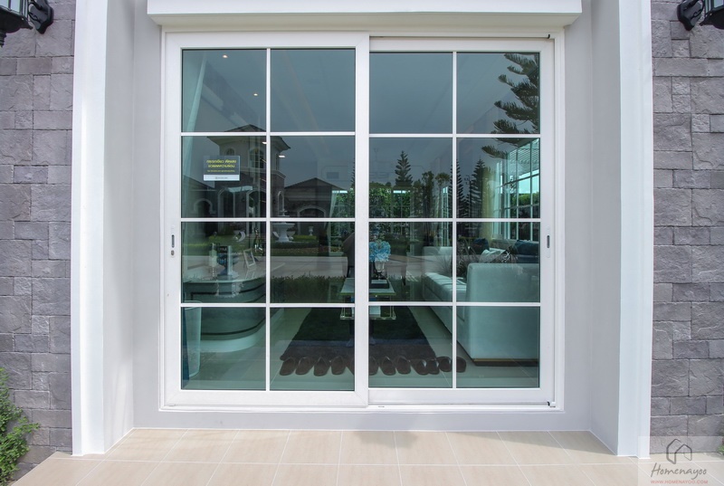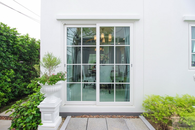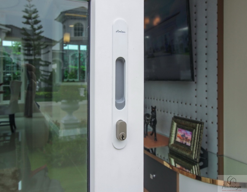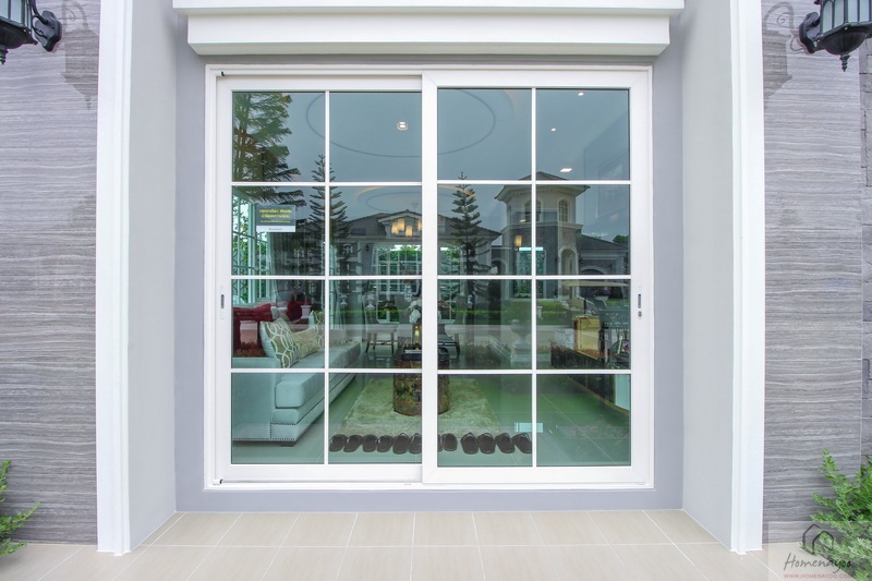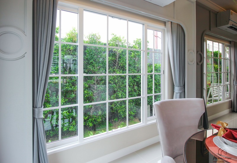 ประตู-หน้าต่างและวงกบบาน UPVC กรอบอะลูมิเนียมอบขาว ติดกระจกเขียวตัดแสง พื้นภายในบ้านปูด้วยกระเบื้องแกรนิตโต้ ผนังฉาบเรียบทาสีพื้น ส่วนชั้นบนปูพื้นลามิเนตลายไม้ ไฟภายในบ้านใช้โคมดาวน์ไลท์ ส่วนนอกบ้านมีทั้งโคมซาลาเปา, โคมดาวน์ไลท์ และไฟกิ่ง