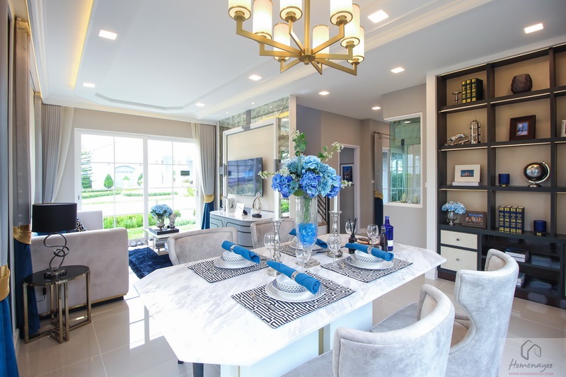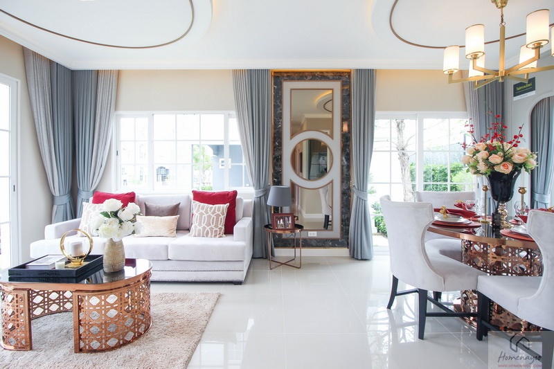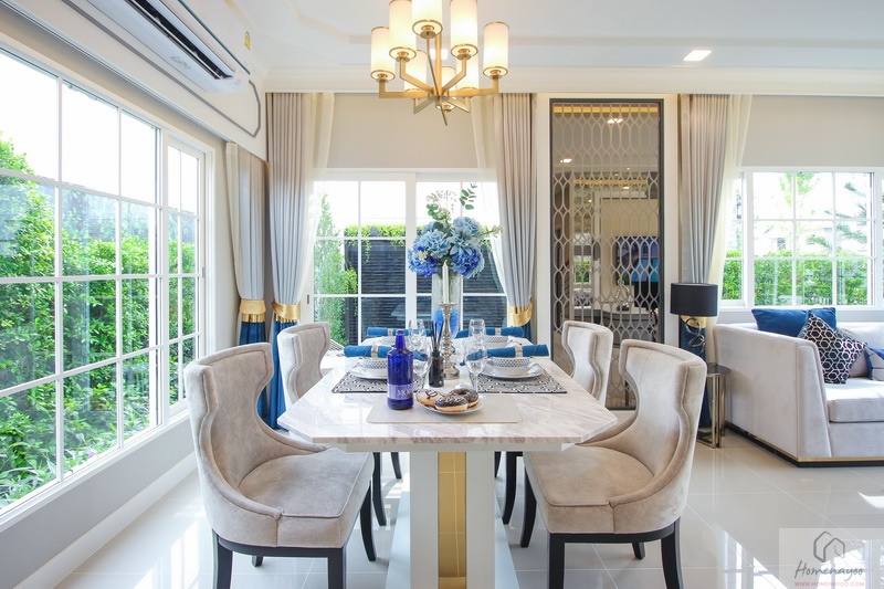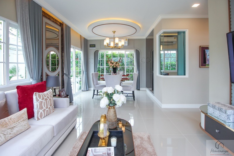 ห้องนั่งเล่นของบ้านโปร่งสบาย จัดวางเฟอร์นิเจอร์ได้อย่างลงตัว มีหน้าต่างบานใหญ่ ห้องครัวทันสมัย กว้างขวาง และสะดวก ห้องนอน Master Bedroom ขนาดใหญ่มีห้องน้ำ และโซน Walk-in Closet ในตัว