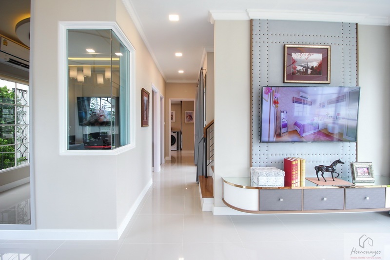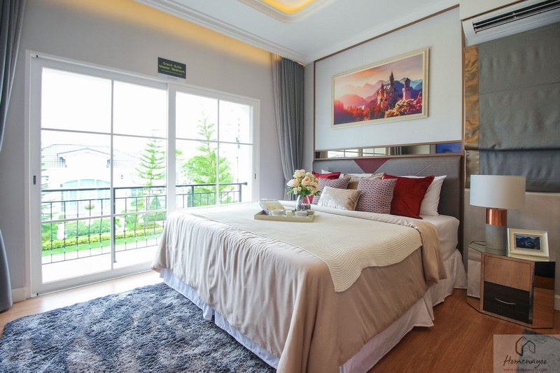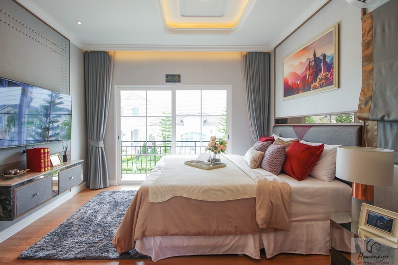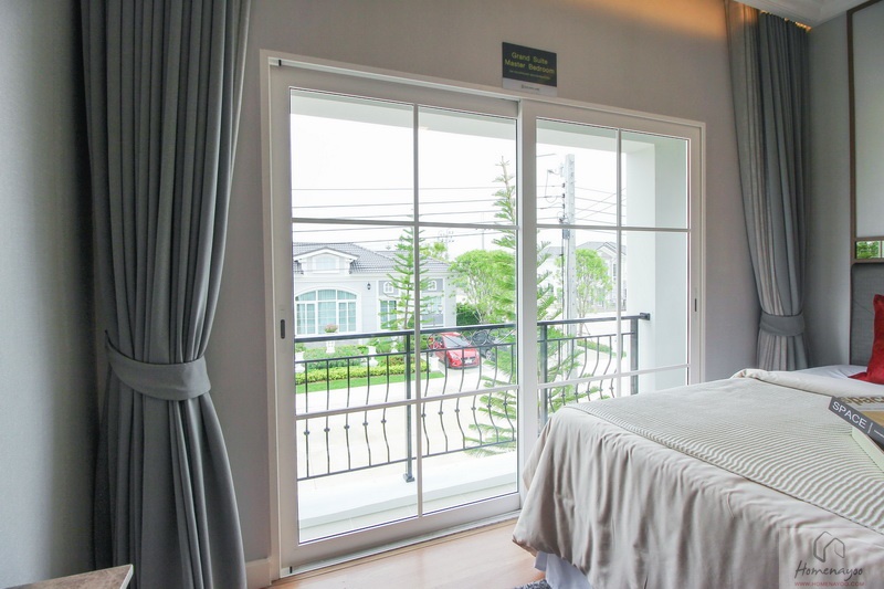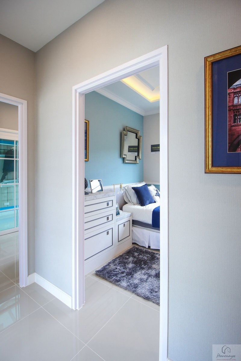 ฝั่งหัวเตียงด้านบนบ้านตัวอย่างกรุเป็นผนังสวยงาม สามารถวางโต๊ะข้างเตียงได้ทั้ง 2 ฝั่ง ที่ผนังมีหน้าต่างบานใหญ่เป็นช่องรับแสงธรรมชาติอีก 1 บาน