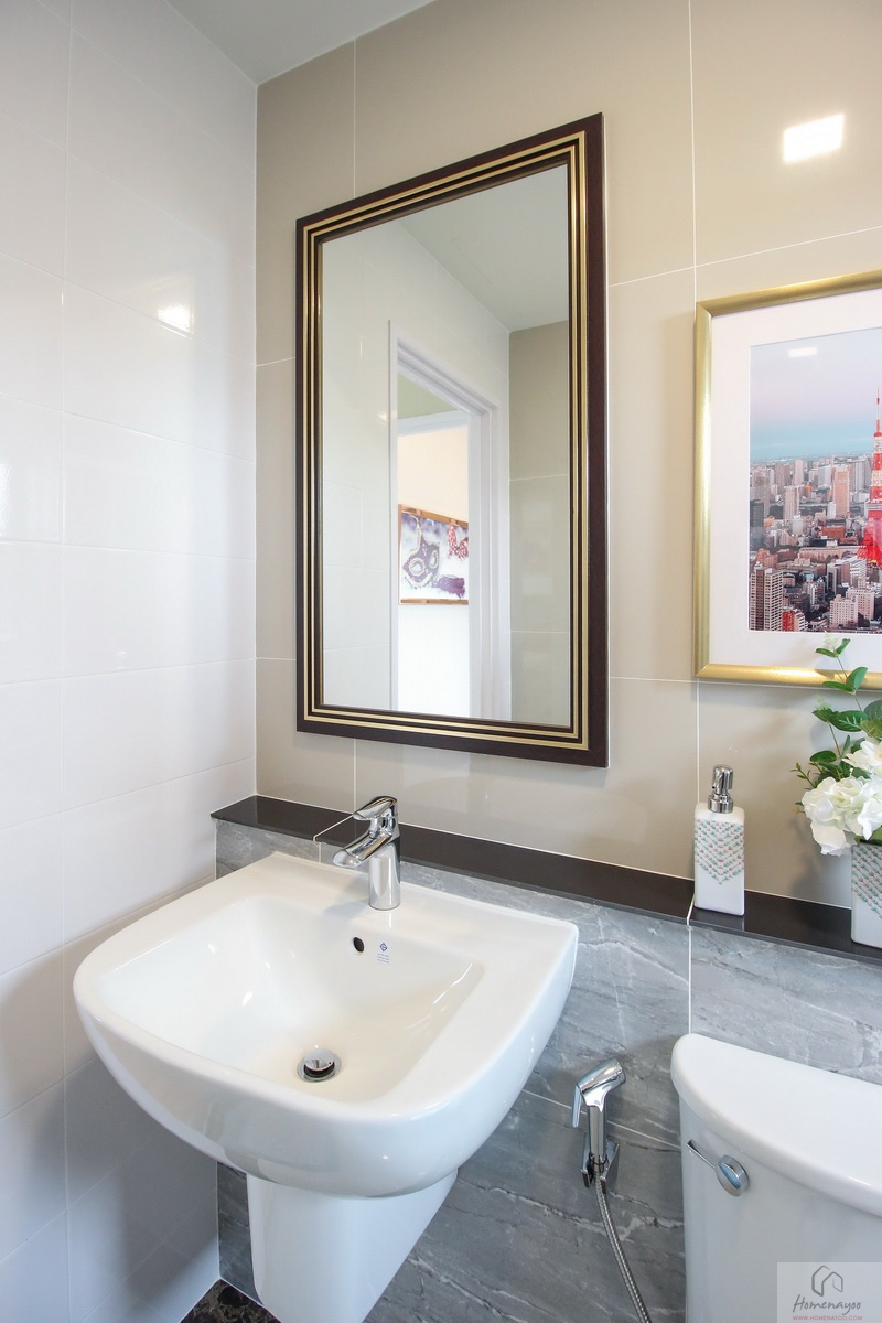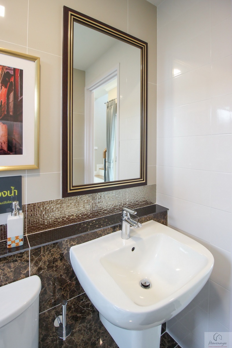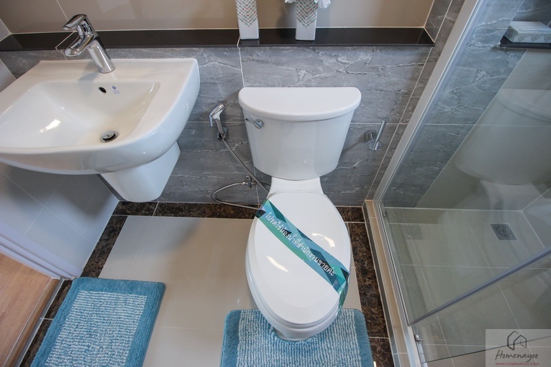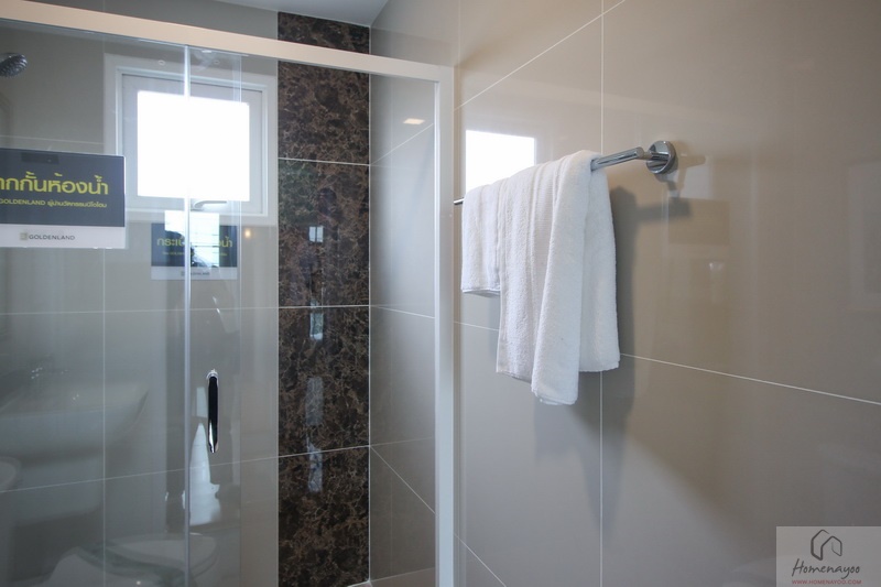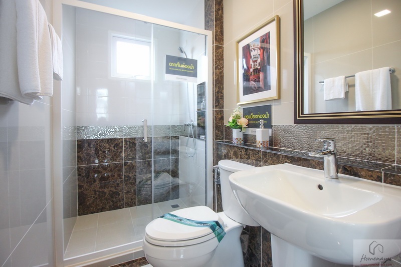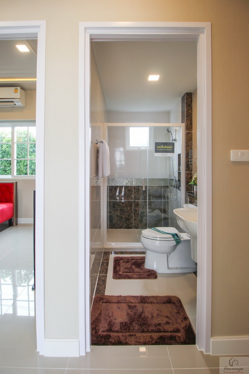 ห้องน้ำทั้งบ้านตัวอย่างและบ้านส่งมอบฟังก์ชันการใช้งานต่าง ๆ จะเหมือนกันหมดเลย พื้นและผนังปูด้วยกระเบื้องห้องน้ำ ฝาผนังมีการสลับลายกระเบื้องเซรามิกที่มีลวดลายในบางช่วง ห้องน้ำจัดเป็นสัดส่วน แยกส่วนแห้งส่วนเปียกชัดเจนด้วยฉากกั้นอาบน้ำ