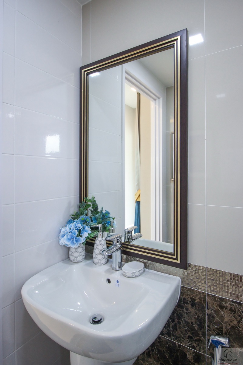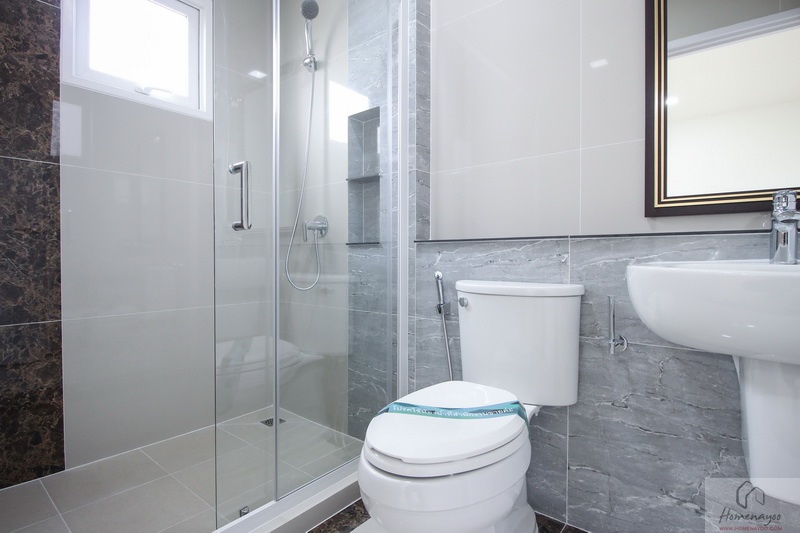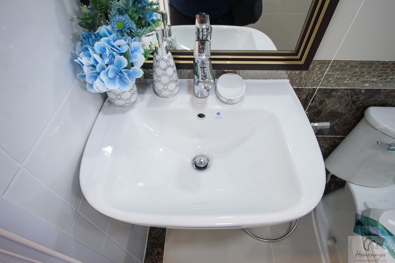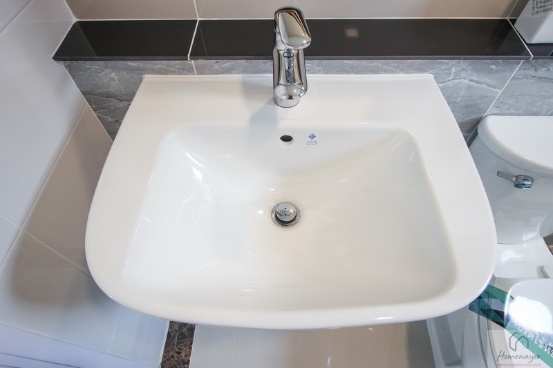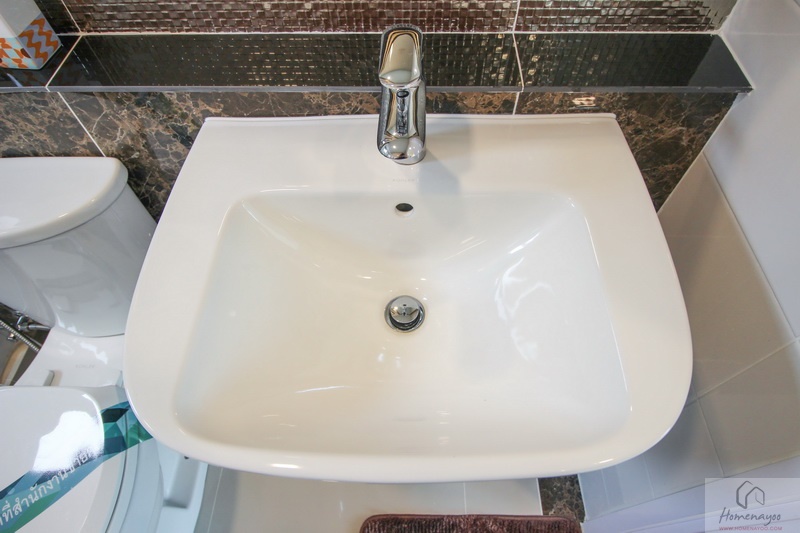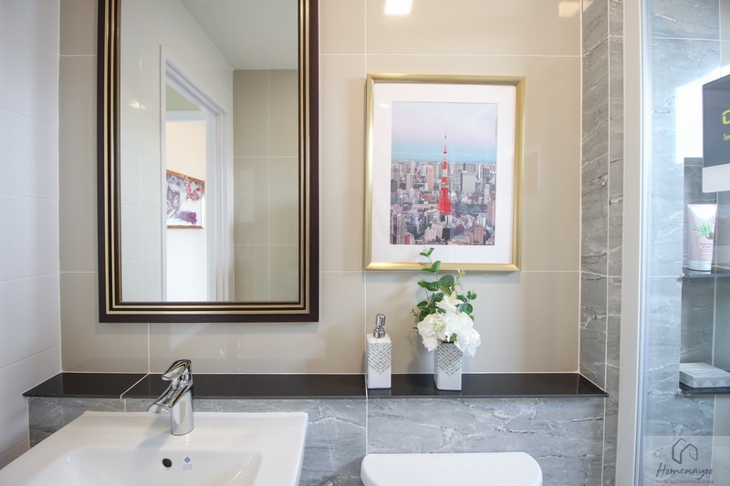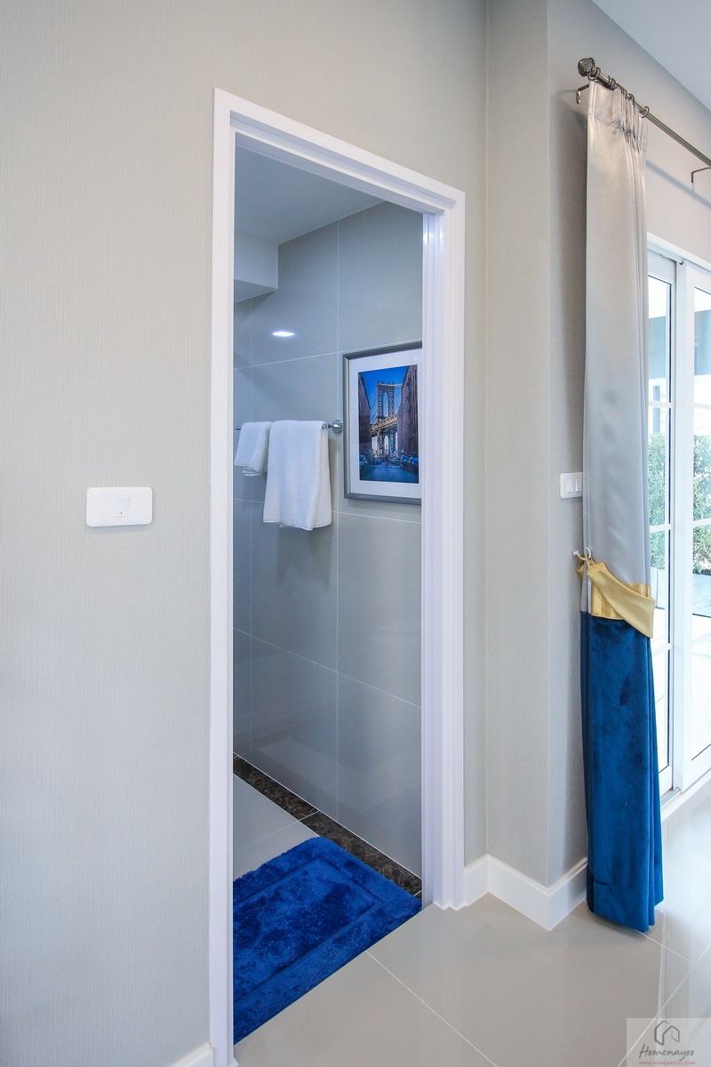 ห้องน้ำทั้งบ้านตัวอย่างและบ้านส่งมอบฟังก์ชันการใช้งานต่าง ๆ จะเหมือนกันหมดเลย พื้นและผนังปูด้วยกระเบื้องห้องน้ำ ฝาผนังมีการสลับลายกระเบื้องเซรามิกที่มีลวดลายในบางช่วง ห้องน้ำจัดเป็นสัดส่วน แยกส่วนแห้งส่วนเปียกชัดเจนด้วยฉากกั้นอาบน้ำ