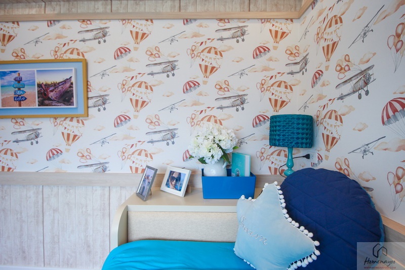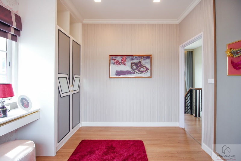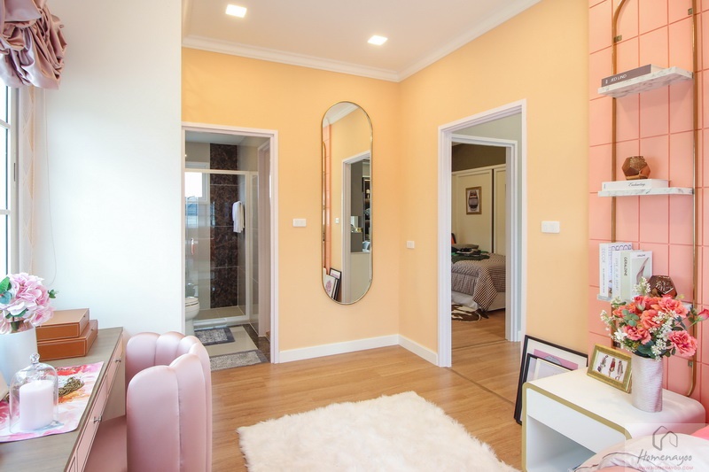 สามารถวางเตียงขนาด 3-5 ฟุตได้สบาย ๆ และหากวางชิดริมผนังห้องจะทำให้พื้นที่ห้องเหลือค่อนข้างกว้าง สำหรับบ้านตัวอย่างส่วนนี้ติดวอลเปเปอร์โทนสีชมพูเพิ่มความสดใส