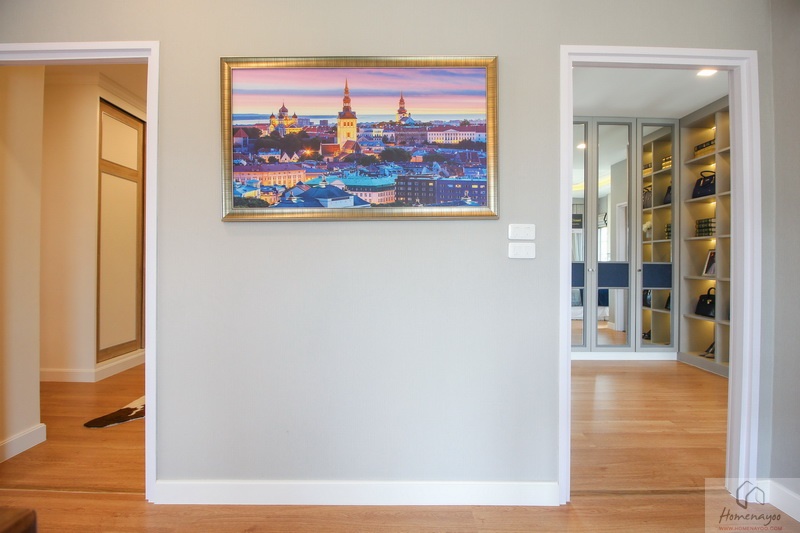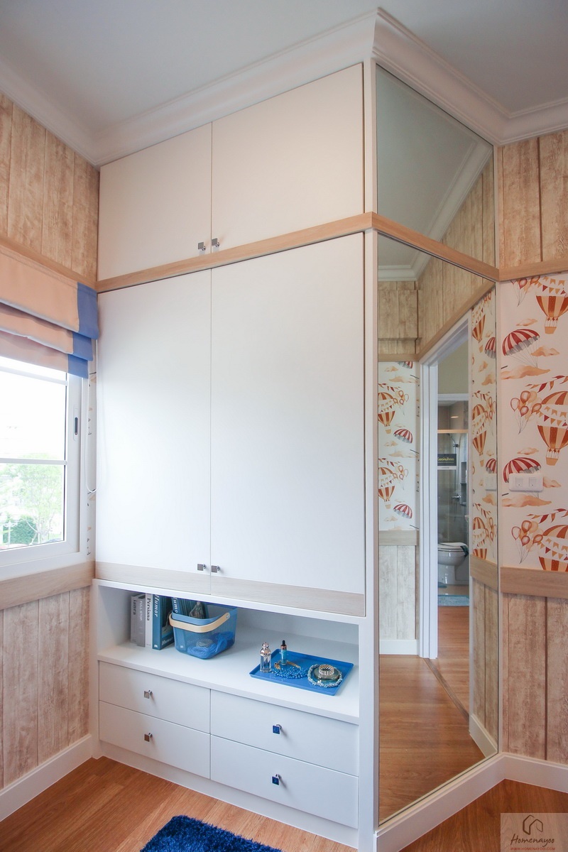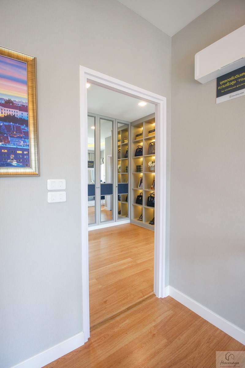 บริเวณนี้ติดกับประตูทางเข้าห้องบิวท์อินเป็นตู้เสื้อผ้าบานเปิดขนาดจรดเพดาน ด้านข้างกรุเป็นกระจกเงาแผงใหญ่