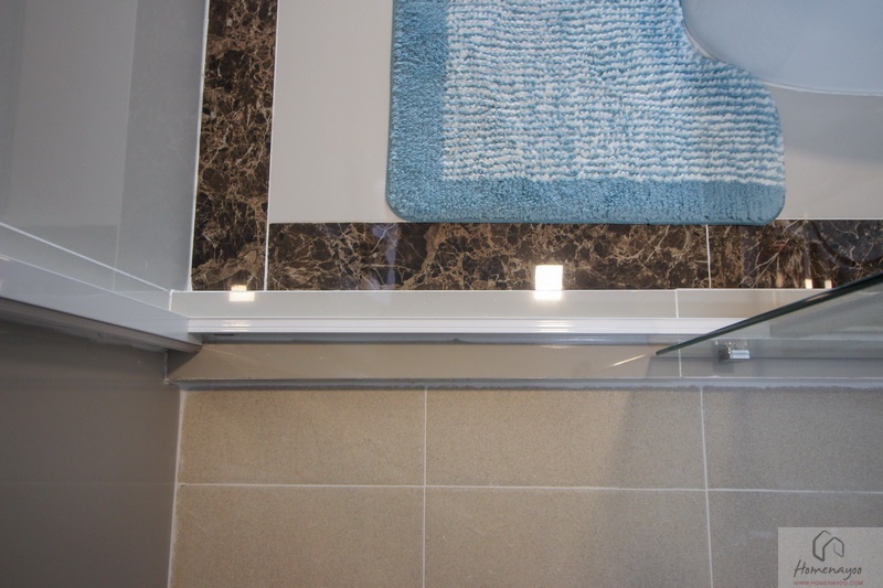 บริเวณมุมอาบน้ำฝักบัวใช้ของ Kohler มีการเจาะกำแพงทำเป็นชั้นวางของใช้ต่าง ๆ เพิ่มเติมด้วย