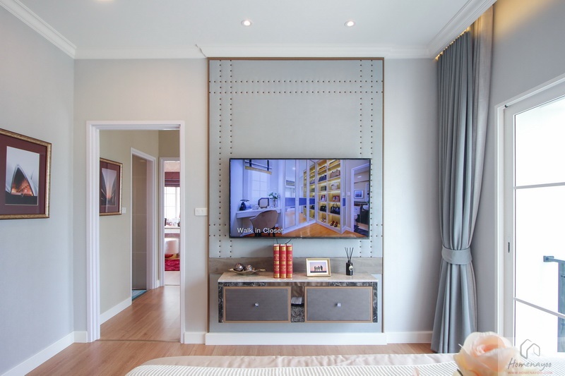 ฝั่งปลายเตียงบิวท์อินเป็นชั้นวางทีวี พร้อมแขวนทีวีไว้ที่ผนังเพื่อเพิ่มพื้นที่ใช้สอย ข้างบนชั้นวางทีวีมีที่เหลือให้วางของตกแต่งอื่น ๆ ได้อีก ส่วนการดูทีวีก็อยู่ในระยะกำลังดีพอเหมาะเลย