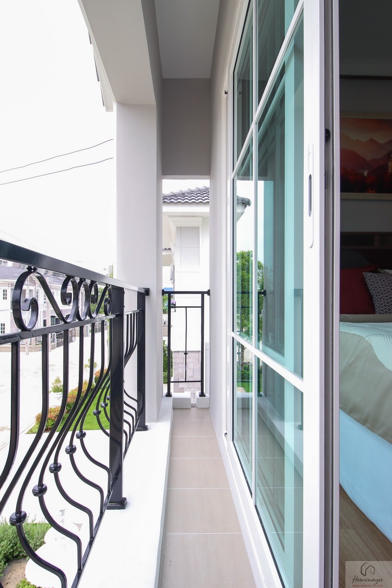ระเบียงปูด้วยพื้นกระเบื้องเซรามิกโทนสีอ่อน รั้วกันตกทาสีดำเข้ม