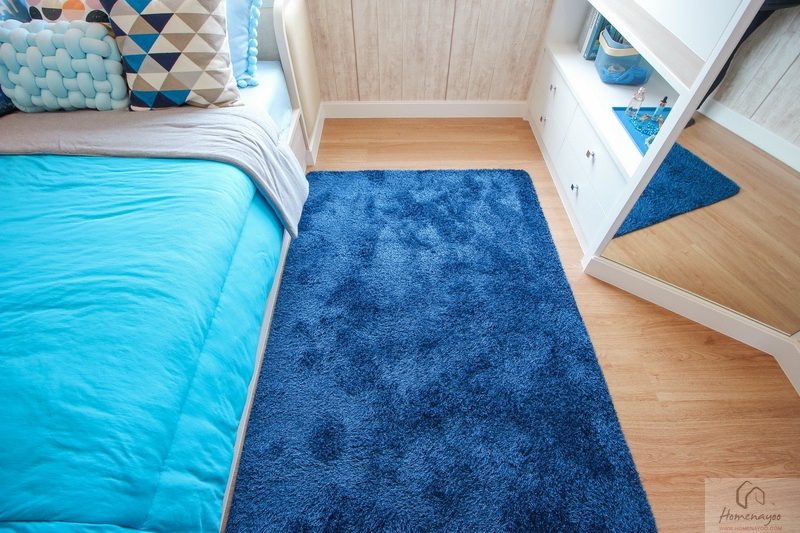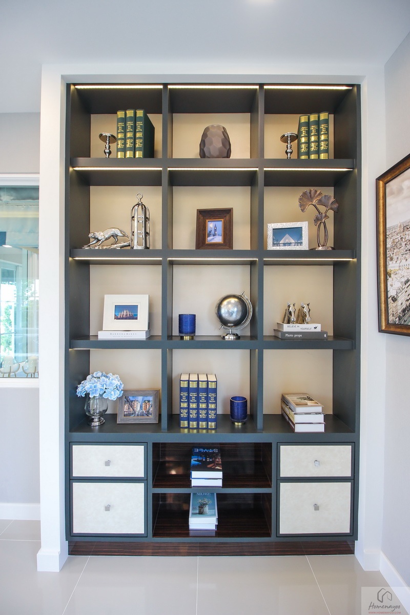 ฝั่งปลายเตียงในส่วนนี้บิวท์อินเป็นชั้นวางของขนาดกำลังดีเต็มพื้นที่ ใช้วางของใช้ หรือโคมไฟตั้งโต๊ะ ทำให้จะไม่มีที่เหลือสำหรับเดินขึ้นลงเตียงนะคะ