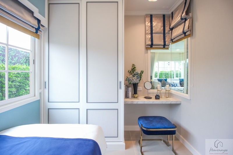 ติดกับมุมโต๊ะเครื่องแป้ง ทางโครงการได้บิวท์อินเป็นตู้เสื้อผ้าบานเปิดทรงสูงขนาดใหญ่