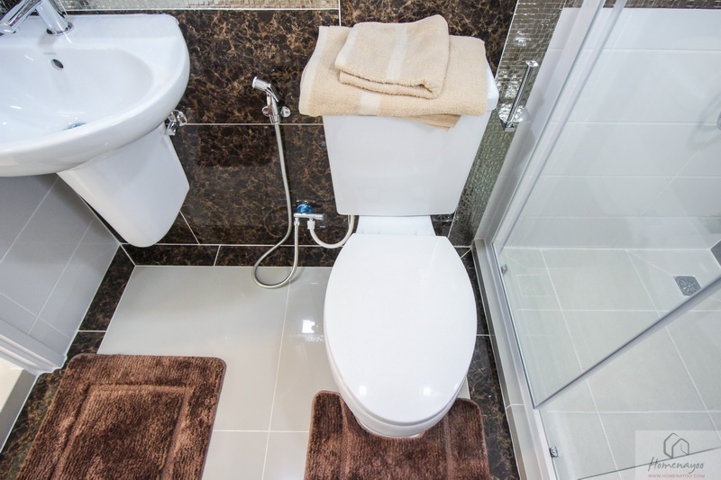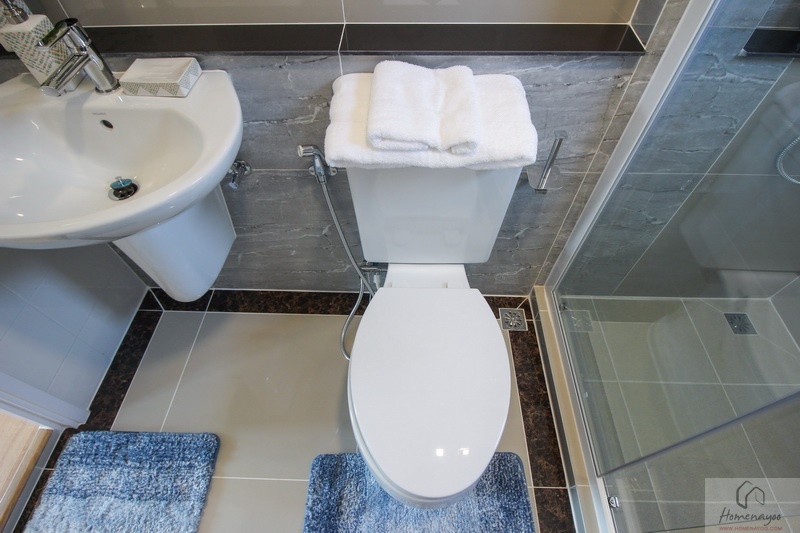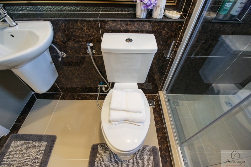 โถสุขภัณฑ์เป็นแบบแยกชิ้นระบบ Dual Flush จาก Englefield ระยะการติดตั้งใช้งานกำลังดี มีที่แขวนทิชชู่และสายฉีดชำระติดตั้งให้ทางฝั่งซ้าย ด้านหลังก่อเป็นกำแพง Low Wall