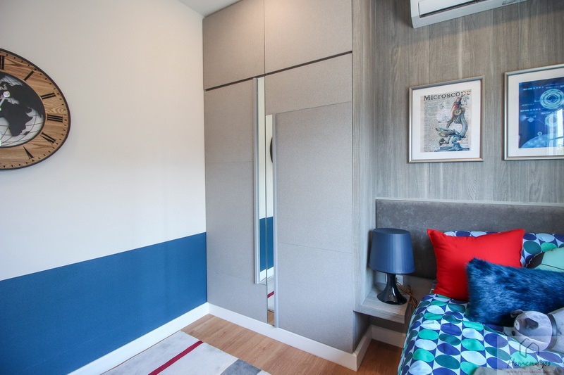 ถัดมาข้างเตียงฝั่งขวาติดกับประตูทางเข้าห้องห้องตัวอย่างบิวท์อินเป็นตู้เสื้อผ้าทรงสูงขนาดพอเหมาะ และมีประตูไปยังห้องน้ำในตัว