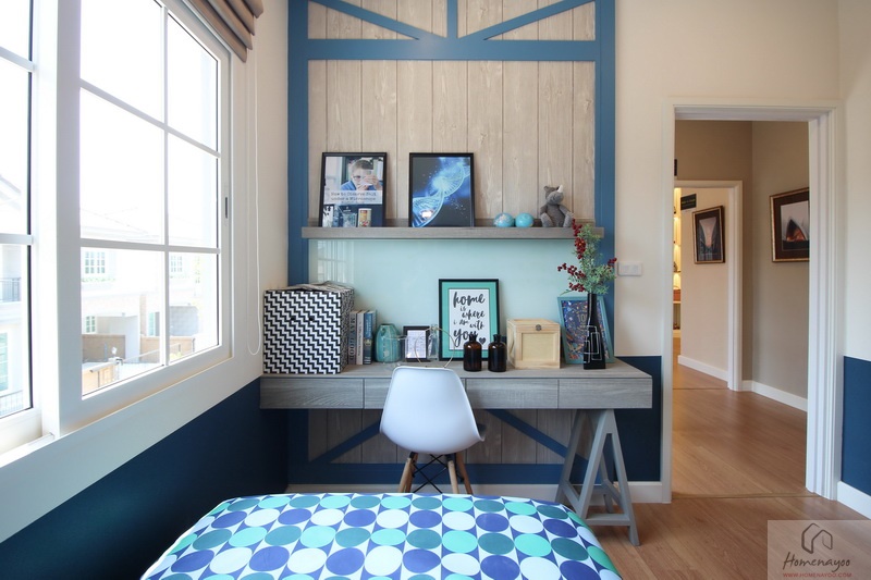 มุมโต๊ะทำงานมีขนาดพอเหมาะ บิวท์อินเป็นเคาน์เตอร์ขนาดกำลังดีใช้เป็นโต๊ะทำงานหรือจะนั่งอ่านหนังสือก็ได้ ได้รับแสงสว่างจากภายนอกเข้ามากำลังดี