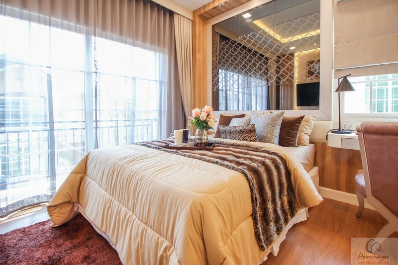 ฝั่งหัวเตียงด้านบนกรุผนังสวยงาม สามารถวางโต๊ะข้างเตียงได้ทั้ง 2 ฝั่ง และเฟอร์นิเจอร์อื่น ๆ เพิ่มเติม