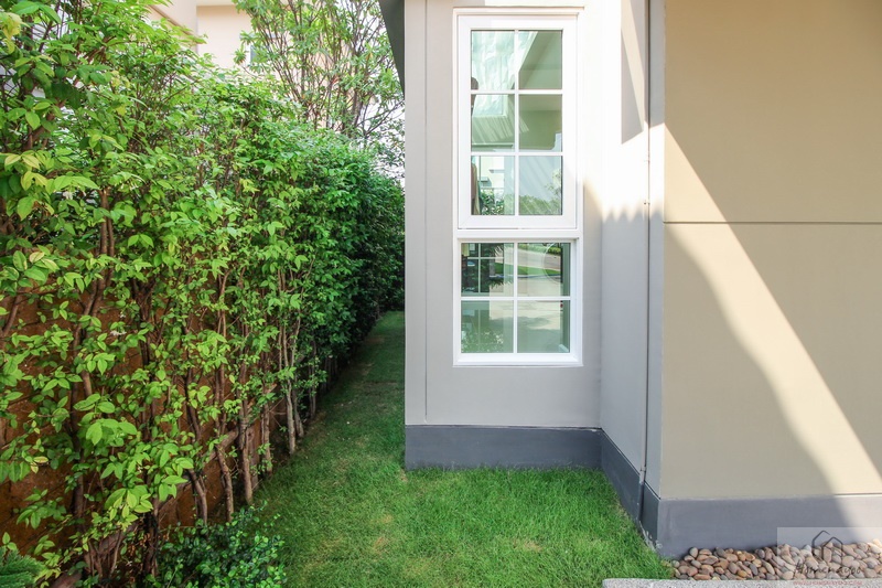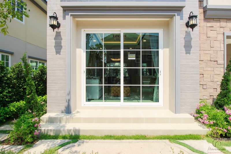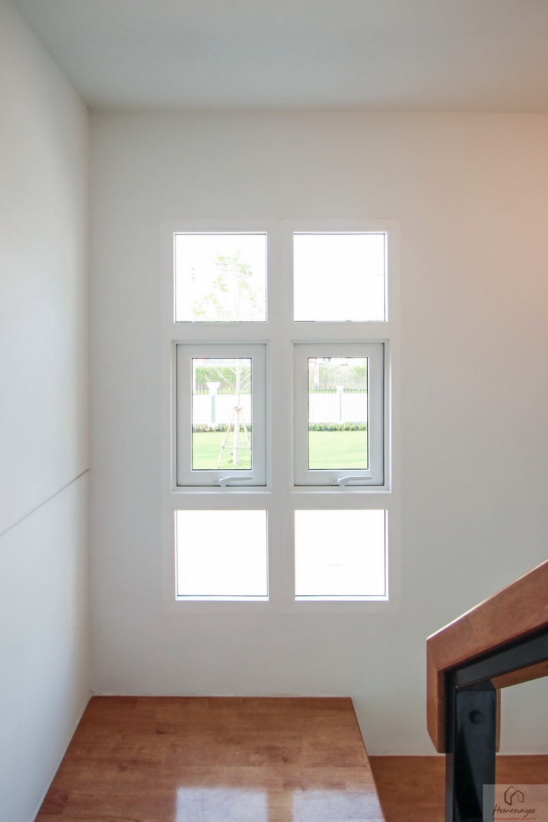 วัสดุ : วัสดุภายในมาตรฐานเทียบเท่าบ้านเดี่ยว ใช้วงกบ ประตูหน้าต่างบานเลื่อนกระจกเขียวตัดแสงกรอบ UPVC สีขาว ด้านบนติดไฟดาวน์ไลท์ พื้นบ้านชั้นล่างปูด้วยกระเบื้องแกรนิตโต้ขนาด 60×60 ซม.