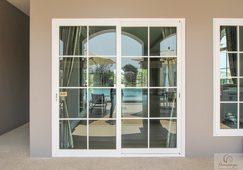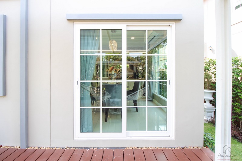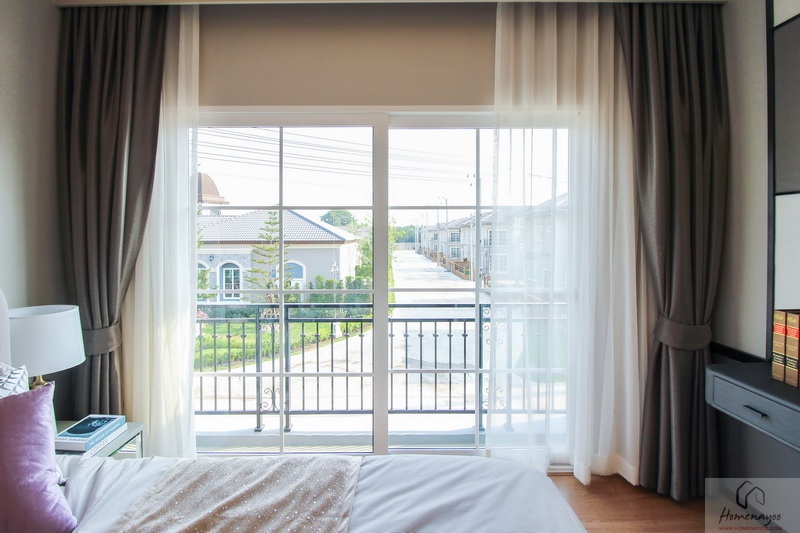 ฝั่งขวาติดกับเตียงนอนมีประตูบานเลื่อนขนาดใหญ่เต็มพื้นที่เปิดออกไปยังระเบียงหน้าบ้าน เราไปดูกันเลยค่ะ