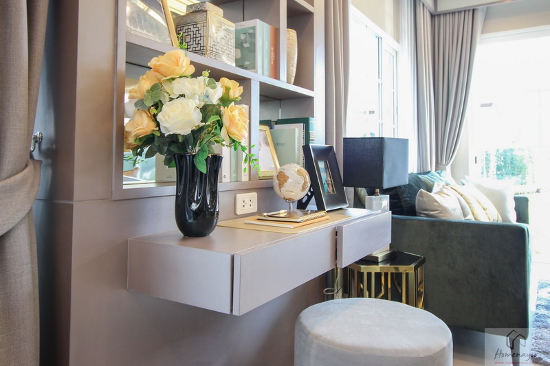 มุมมองจากหน้าประตูระเบียงค่ะ ทางบ้านตัวอย่างทำเป็นมุมโต๊ะทำงาน และตู้เก็บของขนาดใหญ่