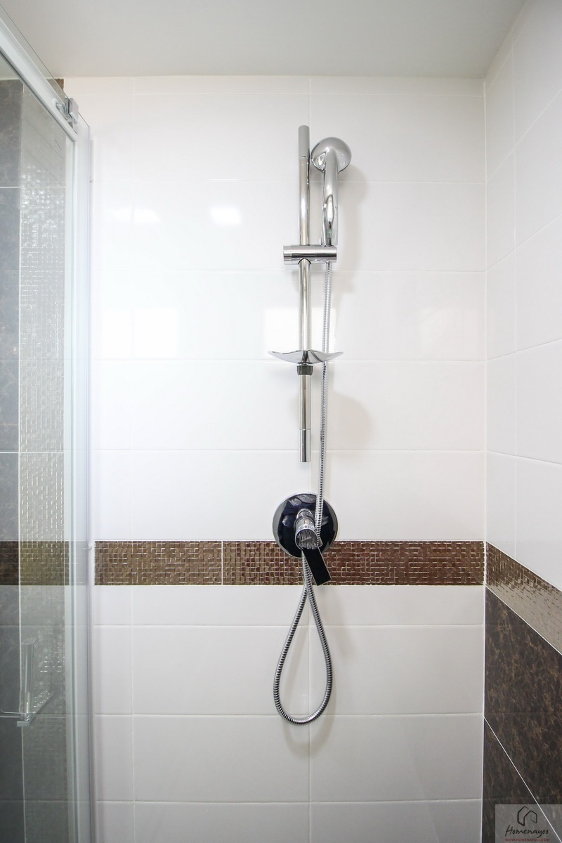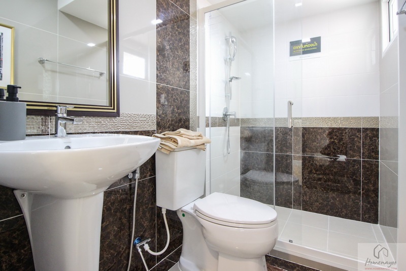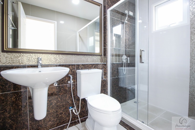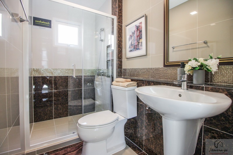 ภายในห้องน้ำของบ้านตัวอย่างและบ้านส่งมอบจะเหมือนกันเลย พื้นปูด้วยกระเบื้องห้องน้ำ ฝาผนังเป็นกระเบื้องลายหินอ่อนสีน้ำตาล และสีเทา ห้องน้ำจัดเป็นสัดส่วน แยกส่วนแห้งส่วนเปียกชัดเจนด้วยฉากกั้นอาบน้ำ