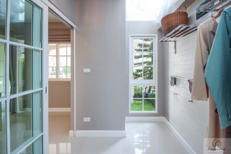 เริ่มที่โซน Walk-in closet ทางบ้านตัวอย่างได้บิวท์อินเป็นตู้เสื้อผ้าขนาดใหญ่ และตู้เก็บของ มีมุมโต๊ะเครื่องแป้งวางชิดติดกับหน้าต่าง