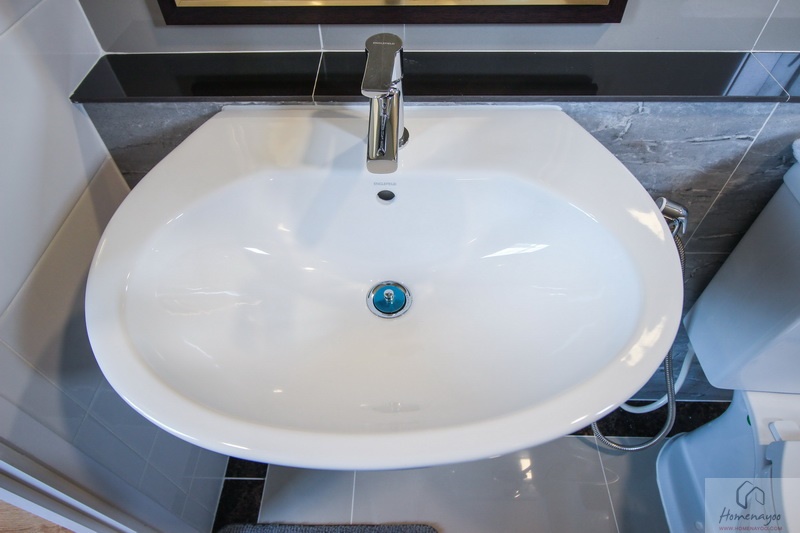 ใช้อ่างล้างมือจาก Englefield แบบลอยติดผนัง คู่กับก็อกน้ำแบบปัดขึ้น หน้าอ่างมีพื้นที่เหลือให้วางของใช้ได้อีก