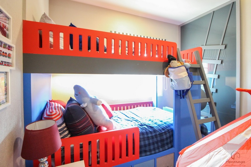 มุมพักผ่อนวางเตียงนอนรถไฟ 2 ชั้น ข้างเตียงเป็นเต็นท์โดมเด็กเล่นมีของเล่นด้านใน