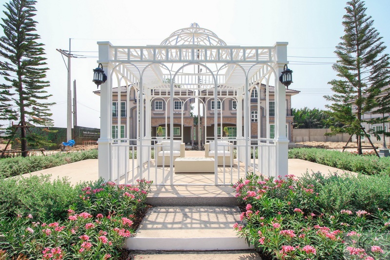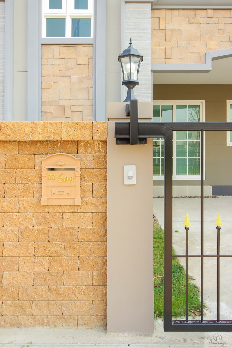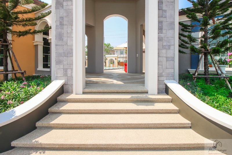 ด้านขวามีป้ายชื่อโครงการขนาดใหญ่ ตกแต่งด้วยสวนหย่อมขนาดเล็ก ปกคลุมไปด้วยต้นไม้พุ่มไม้สีเขียวทั่วบริเวณ ให้ความรู้สึกเป็นธรรมชาติ