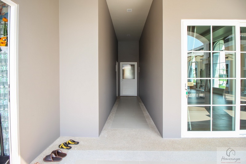 โดยมุมนี้ของบ้านส่งมอบจะเป็นผนังฉาบเรียบทาสีขาว มีประตูเปิดออกไปยังพื้นที่ระเบียงเห็นวิวหน้าบ้าน และมีหน้าต่างระบายอากาศให้อีก 1 บาน