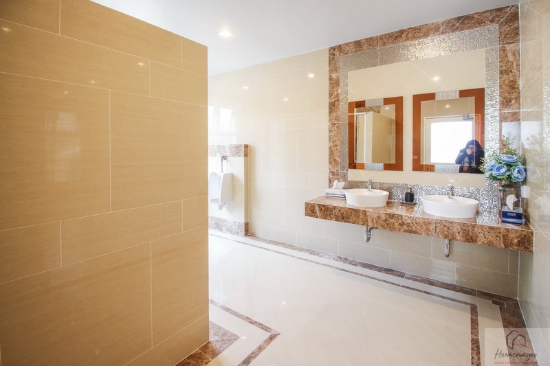 ห้องน้ำฟังก์ชันการใช้งานต่าง ๆ จะเหมือนกันหมดเลยทั้งบ้านตัวอย่างและบ้านส่งมอบ พื้นและผนังปูด้วยกระเบื้องห้องน้ำ ฝาผนังมีการสลับลายกระเบื้องเซรามิกแบบเงาที่มีลวดลายในบางช่วง ห้องน้ำจัดเป็นสัดส่วน แยกส่วนแห้งส่วนเปียกชัดเจนด้วยฉากกั้นอาบน้ำ