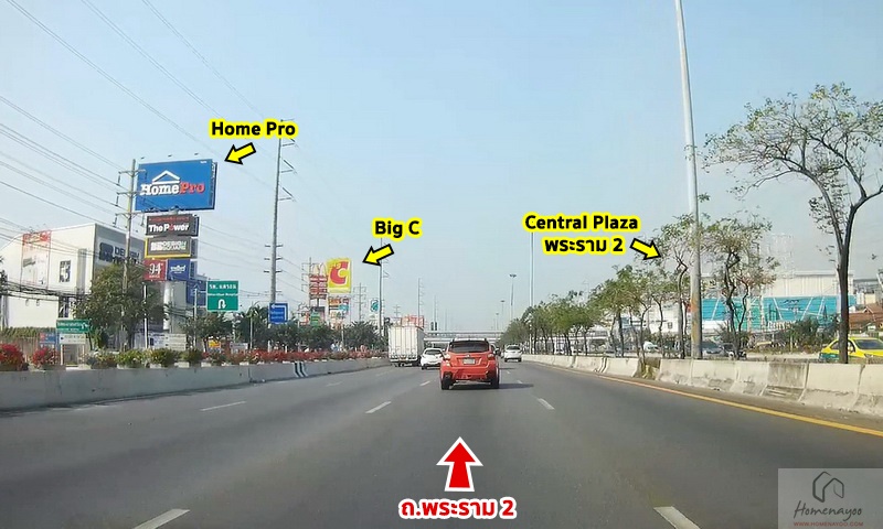 ผ่าน Central Plaza พระราม 2 ทางฝั่งขวา ส่วนทางฝั่งซ้ายจะมองเห็น HomePro และ Big C พระราม 2