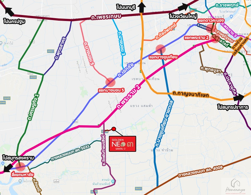 ทางพิเศษเฉลิมมหานคร ตามป้ายไปดาวคะนอง และสมุทรสาคร ⇒ เข้าสู่ ถ.พระราม 2 ⇒ ผ่าน Central Plaza พระราม 2 ⇒ ผ่าน บุญถาวร พระราม 2 ⇒ ผ่านวัดพันท้ายนรสิงห์ ⇒ เลี้ยวซ้ายเข้าสู่ซอยวัดพันท้ายนรสิงห์ ⇒ ขับตรงอีกประมาณ 1.5 กม. ⇒ ถึงโครงการ Golden Neo 3 พระราม 2