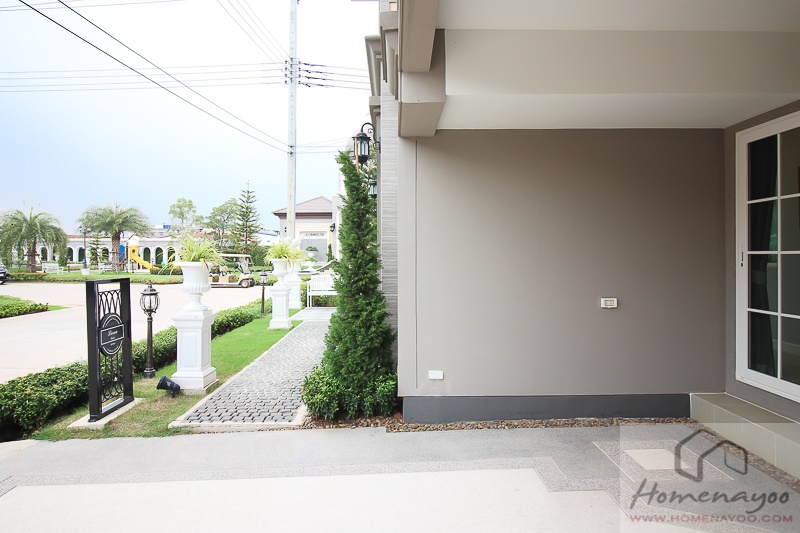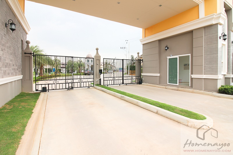เริ่มจากที่รั้วบ้านค่ะ เป็นรั้วเลื่อนระแนงเหล็กตอนเดียว ที่รั้วบ้านจะมีกล่อง Mail Box, กริ่งออด, โคมไฟ และช่องเก็บขยะให้ทุกหลัง