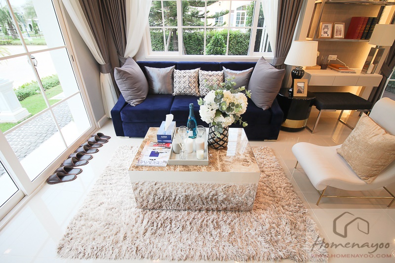 มาดูการจัดวางเฟอร์นิเจอร์ภายในบ้านตัวอย่างกันต่อค่ะ ห้องนั่งเล่นมีขนาดกว้างขวางพอๆ กับบ้านหลังที่แล้ว สามารถวางโซฟาขนาด 3 ที่นั่ง, โต๊ะกาแฟ, อาร์มแชร์, โต๊ะข้าง