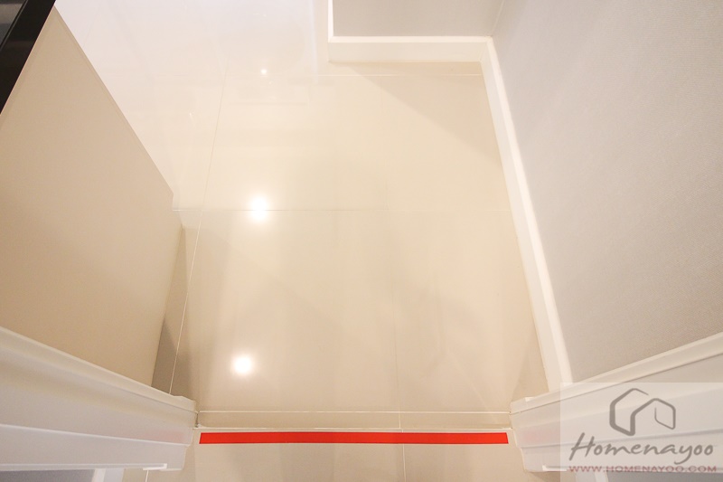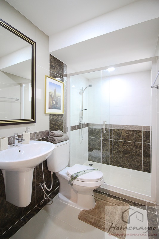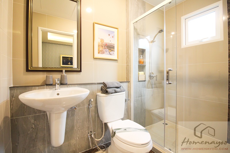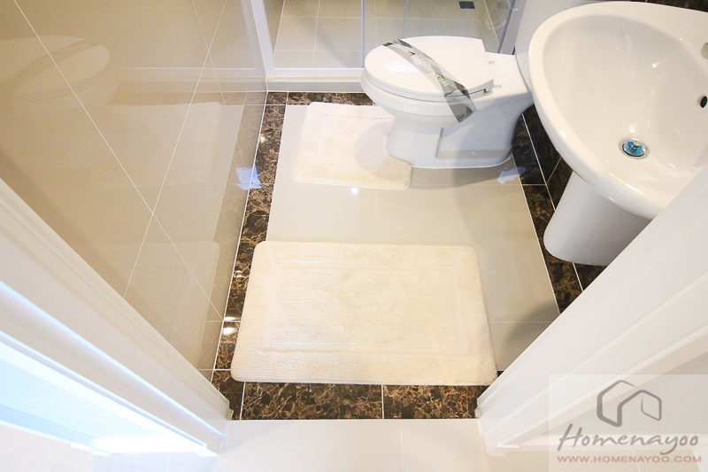 ความโดดเด่นของโครงการอีกข้อก็คือวัสดุที่ทางโครงการได้เลือกใช้ ภายในห้องน้ำมีการคัดสรรกระเบื้องหลายชนิดมาใช้ตกแต่งผนังห้องดูสวยงามหรูหรา ซึ่งอีกหลายๆ โครงการจะไม่ค่อยได้ตกแต่งอะไรมาให้สักเท่าไหร่ และภายในโซน Shower มีการก่อธรณีขึ้นมาเพื่อแบ่งส่วนเปียกและส่วนแห้งออกจากกันอย่างชัดเจน