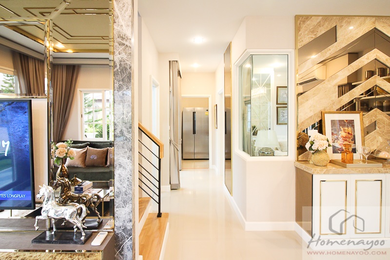 ภายในโถงบันไดจะเป็นตัวเชื่อมสู่ บันไดขึ้นชั้น 2 ห้องน้ำชั้นล่าง และโรงจอดรถฝั่งซ้ายมือ, ห้องครัวกลางโถง และห้องนอนชั้นล่างฝั่งขวามือ
