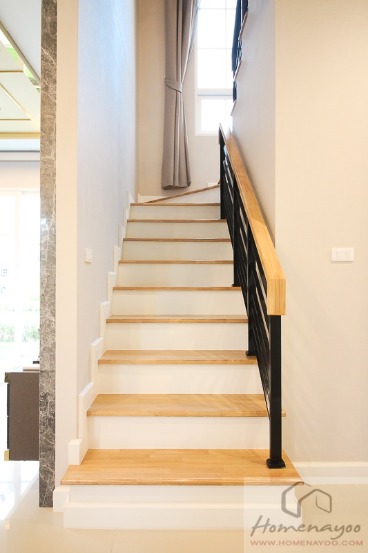 กลับเข้ามาภายในบ้าน เราจะเดินขึ้นไปดูที่ชั้น 2 กันต่อ บันไดมีความกว้าง 1 เมตร พื้นบันไดเป็นไม้ยางพาราอัดประสาน ส่วนราวบันไดเป็นระแนงเหล็กทาสีน้ำมัน มือจับเป็นไม้ใช้สีเข้ากันกับบันได