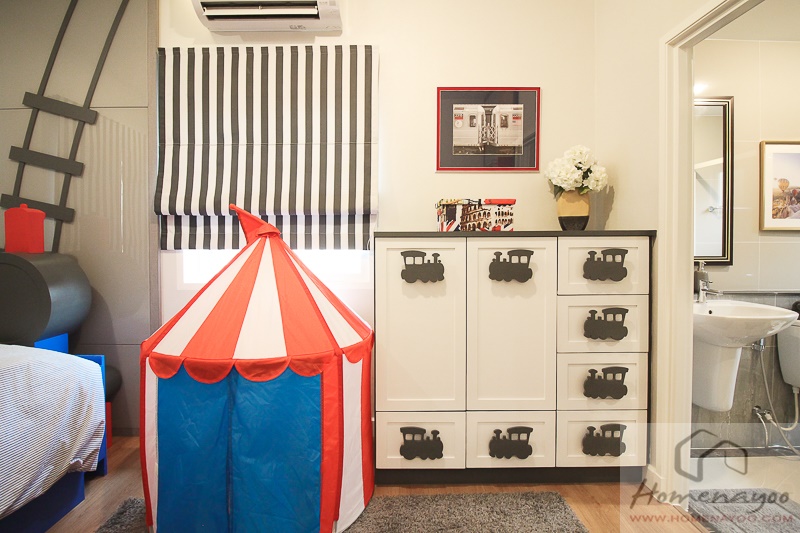 นอกจากนี้เราก็สามารถวางตู้เสื้อผ้าและโต๊ะอ่านหนังสือได้เหมือนเดิม แต่ห้องนี้จัดให้สำหรับเด็กเล็กเลยตกแต่งด้วยของเล่นเด็กแทนค่ะ