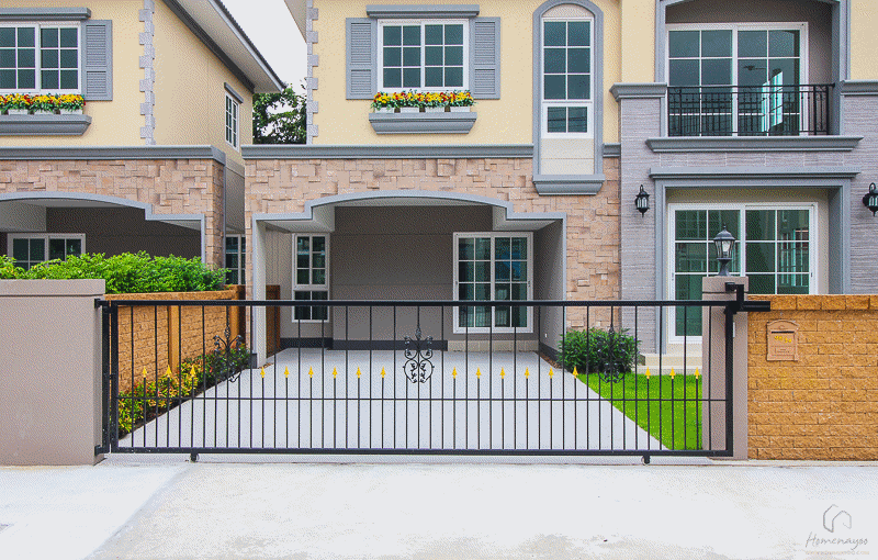 ภายนอกบ้านตกแต่งมาให้สไตล์อิตาลี ประตูรั้วเหล็กหน้าบ้านสีดำ มีช่องทิ้งขยะ มีบ้านเลขที่และ Mail Box พร้อมกริ่งด้านหน้า