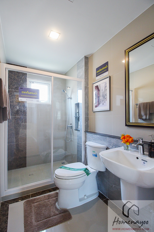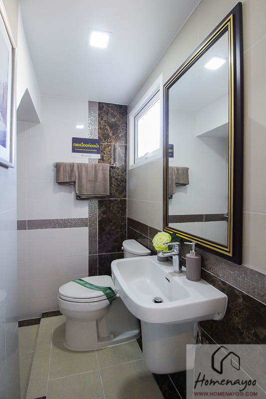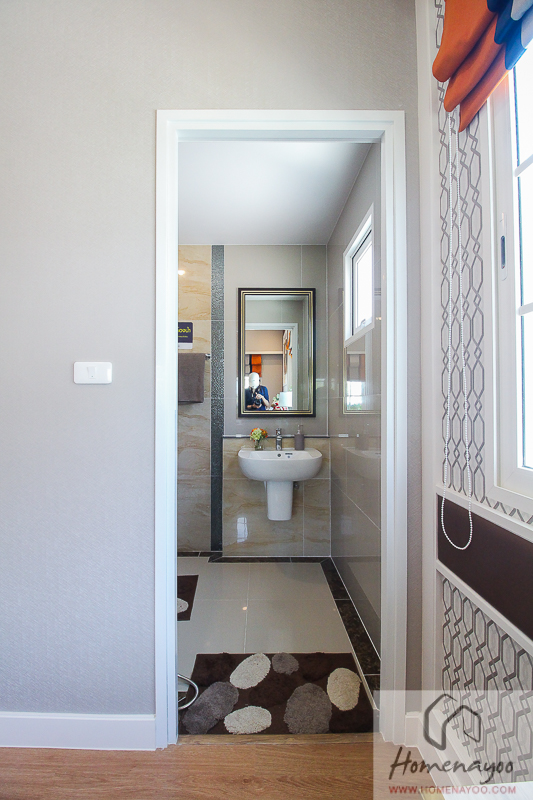 ภายในห้องน้ำจะตกแต่งมาเหมือนๆกับห้องน้ำห้องอื่นๆในบ้าน แต่โทนสีจะเข้มขึ้นมาหน่อย แยกส่วนแห้งส่วนเปียกพร้อมฉากกั้นอาบน้ำมาให้ พร้อมติดตั้งสุขภัณฑ์มาให้ครบ มีช่องแสง 1 จุด เป็นหน้าต่างบานกระทุ้ง กระจกฝ้า